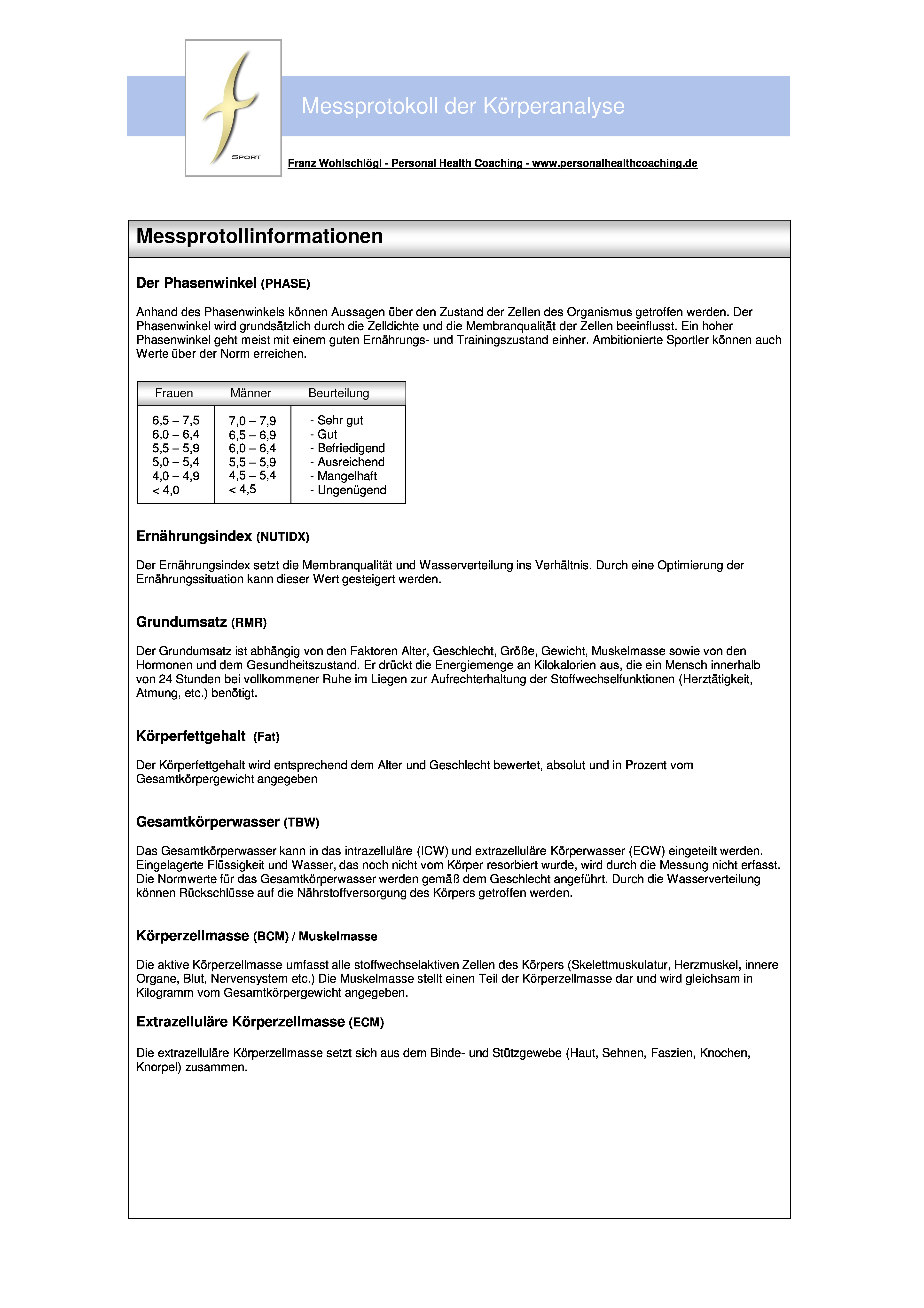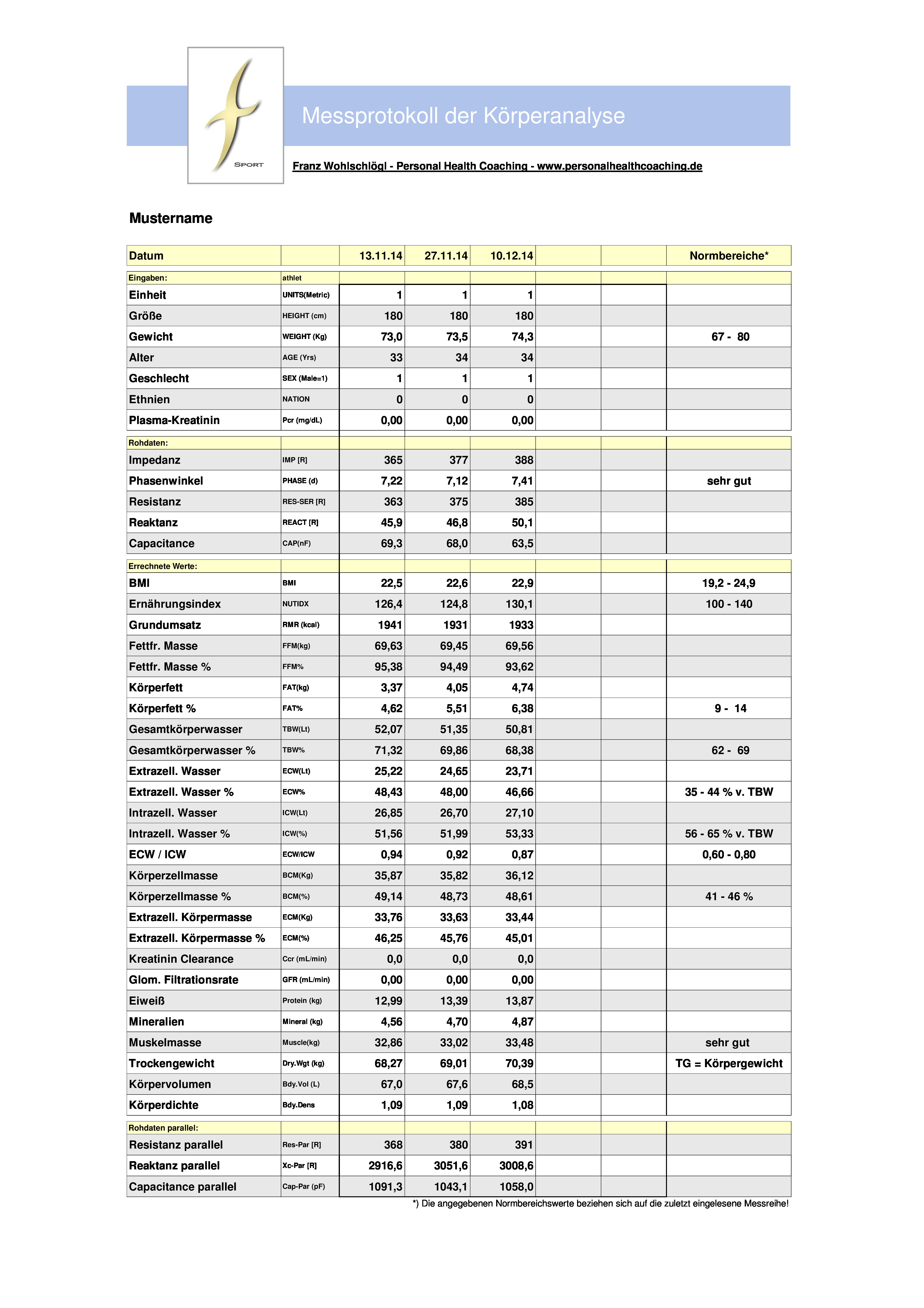 Zusammengefasst wird durch den Vergleich der individuellen Analysedaten mit den dazugehörigen Referenz- bzw. Normwerten der momentane Körperstatus bezüglich Training und Ernährung bestimmt.