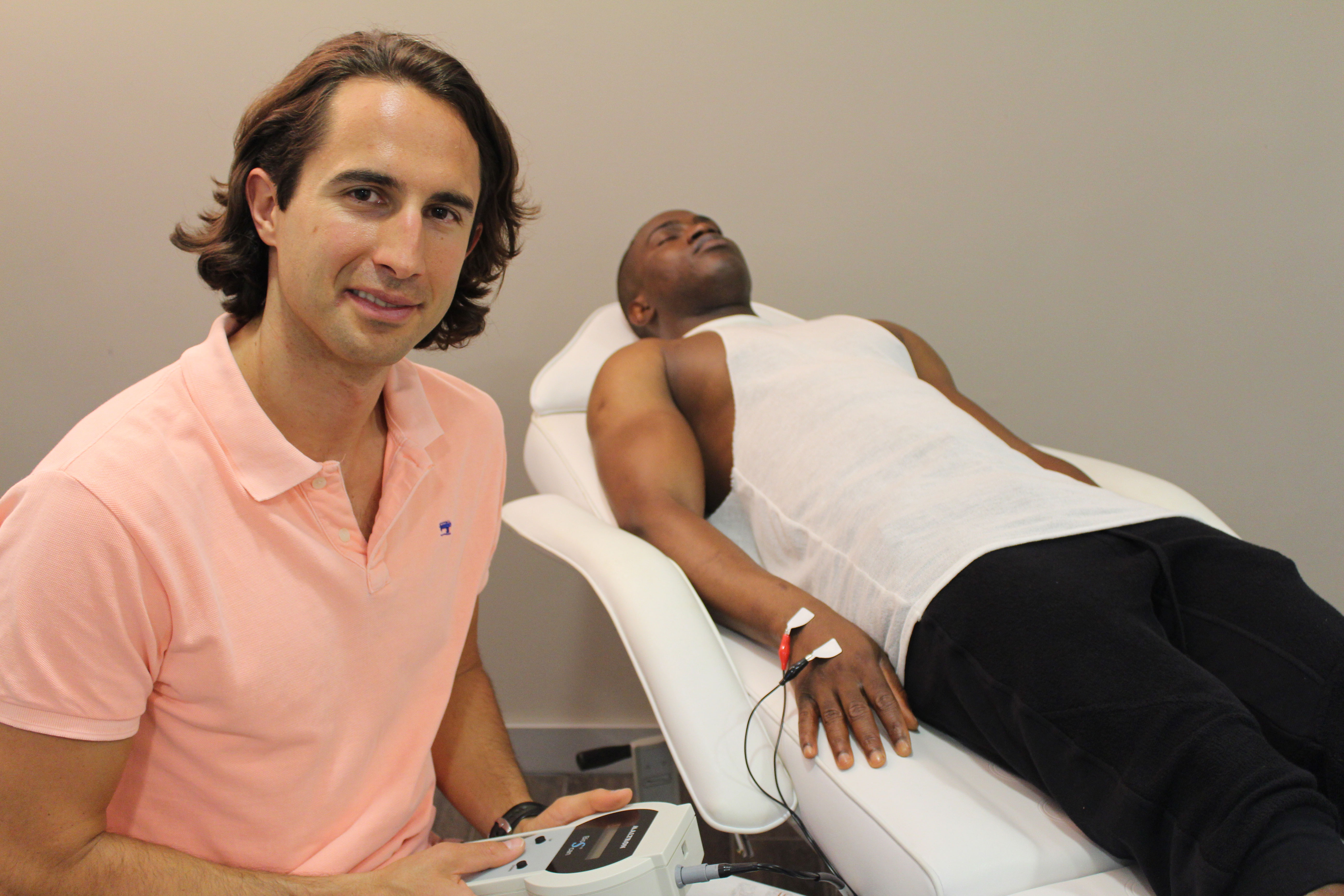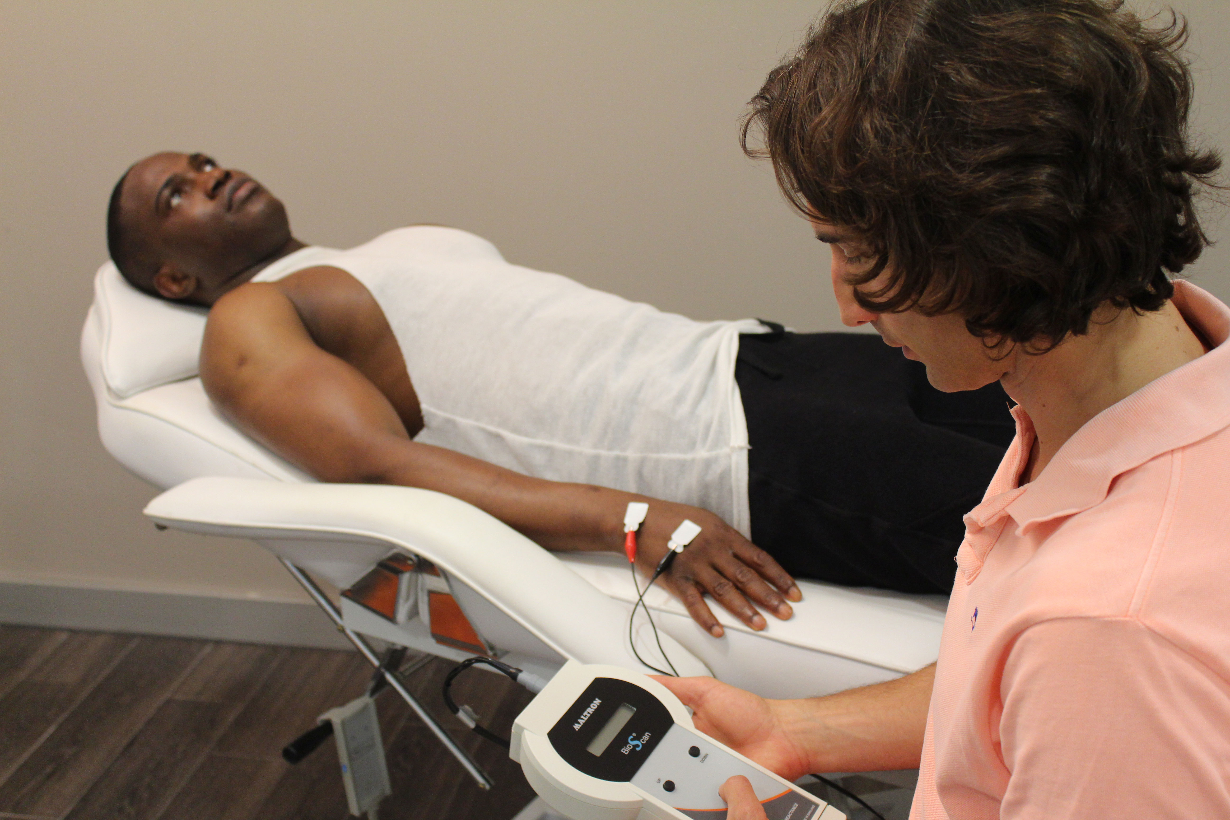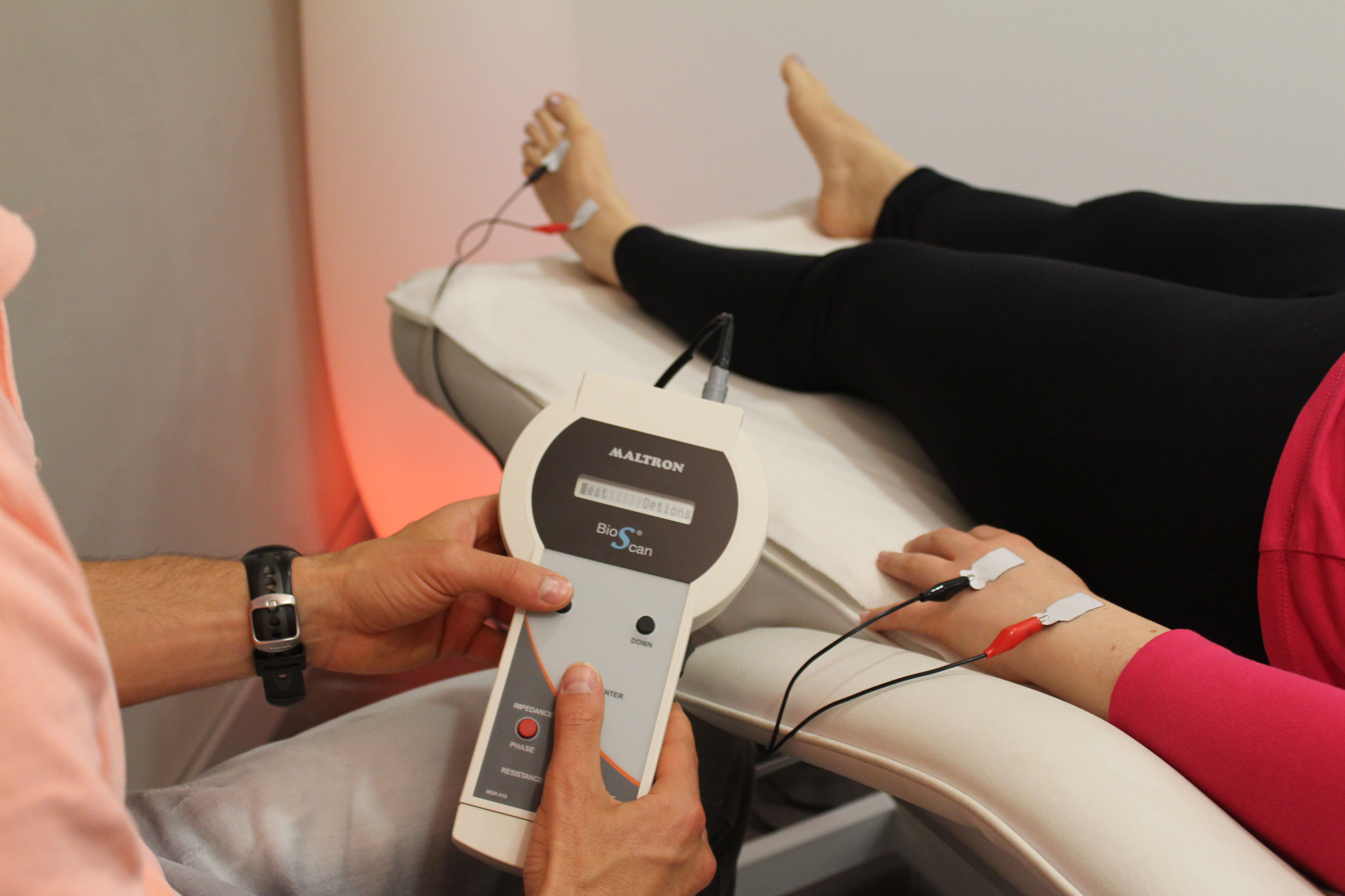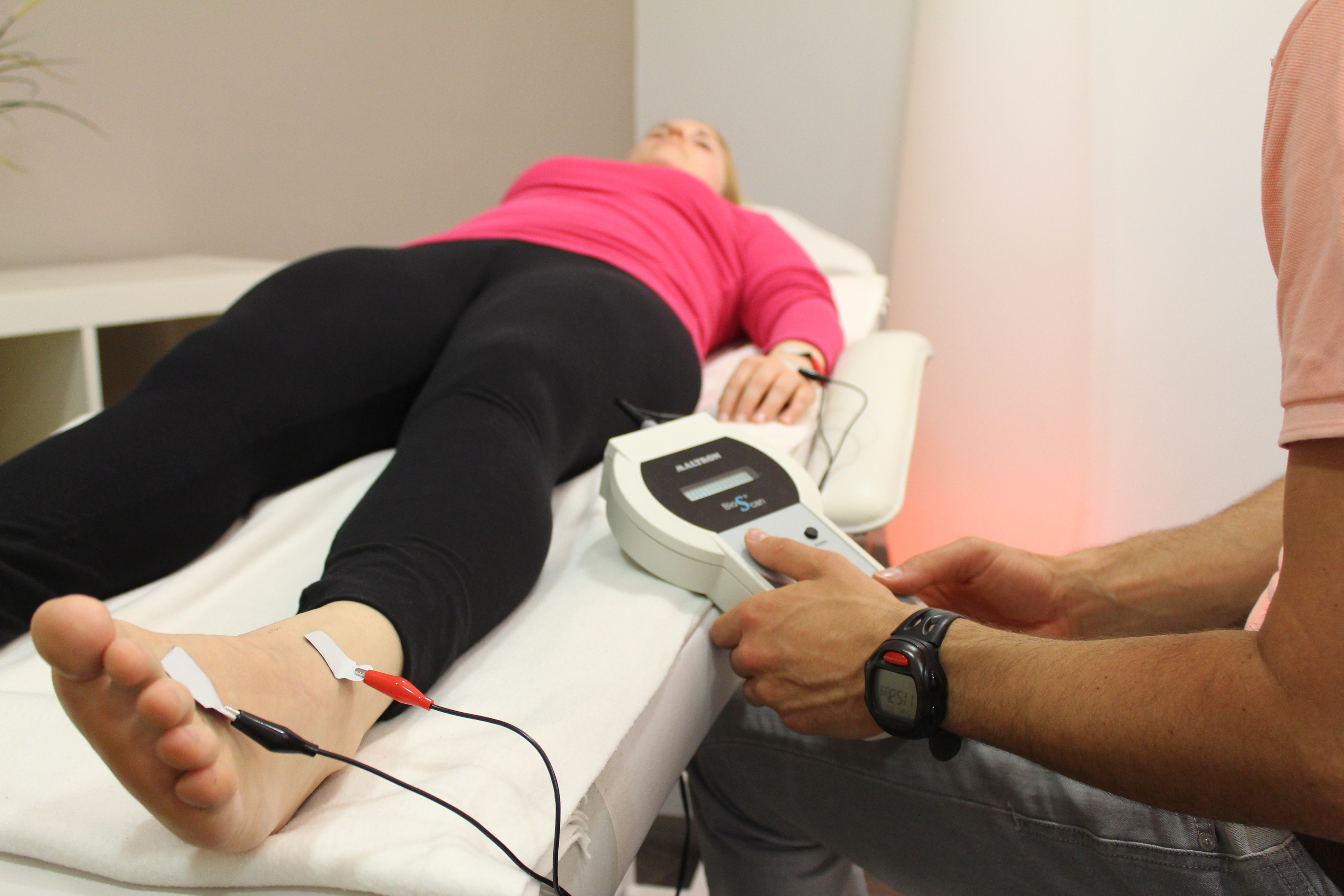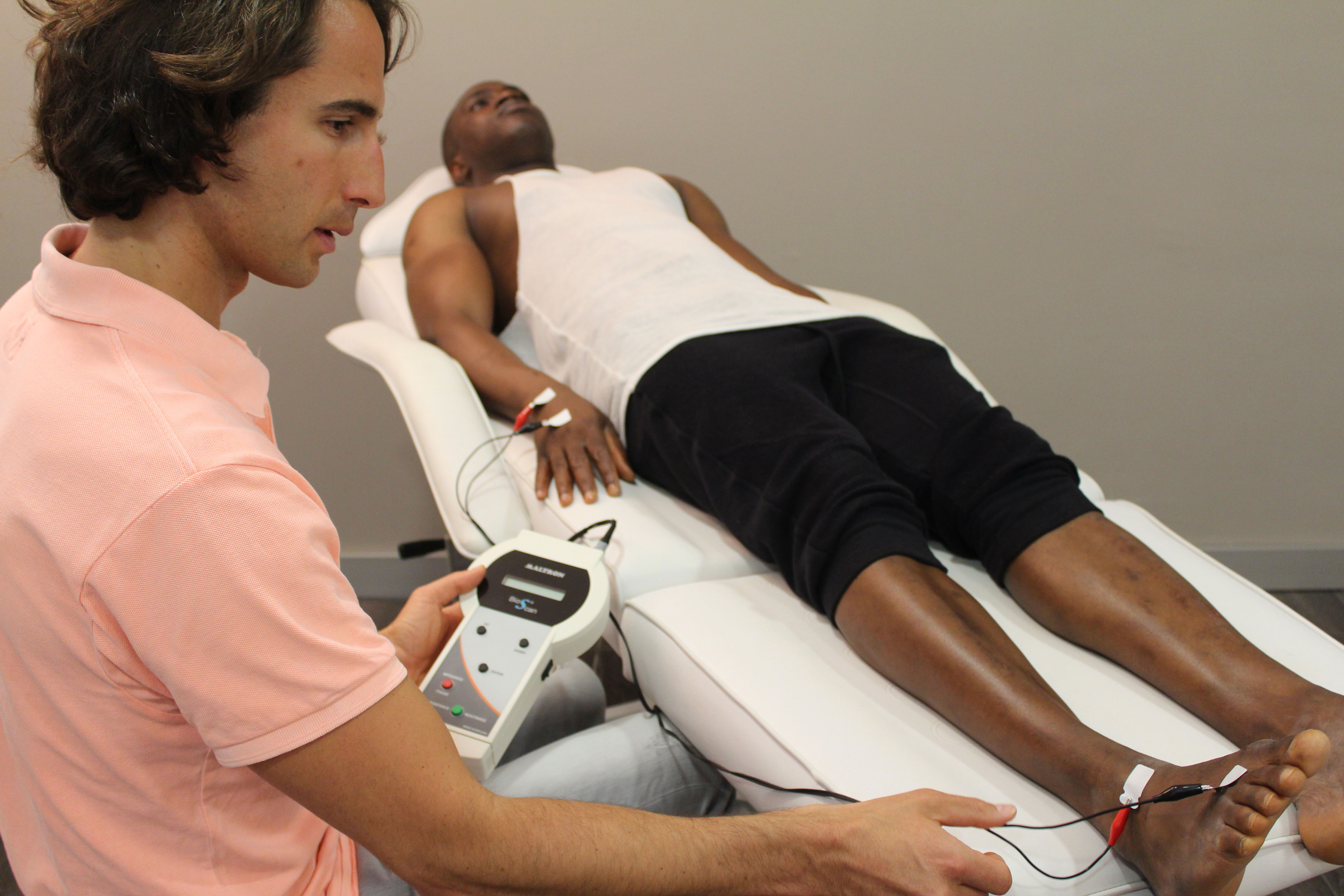 Die Messung erfolgt im Liegen und an der dominanten Körperseite. Die Kontaktstelle von Messgerät und Kunde bilden sogenannte Klebeelektroden, die an Hand- und Fußgelenk platziert werden. Dadurch ist ein entscheidender Vorteil gegenüber herkömmlichen „Fettwaagen“ gegeben, da hierdurch viel genauere Ergebnisse erzielt, da der Schwachstrom durch die gesamte Körperhälfte geleitet wird und nicht nur von Fuß zu Fuß im Unterkörper. Zudem werden die Klebeelektroden an genau festgelegten Stellen angebracht, wodurch eine sehr hohe Reproduzierbarkeit der Messergebnisse bei Eingangs- sowie Folgemessungen gegeben ist. Die Messung an Hand- und Fußgelenk mittels Klebeelektroden verhindert zudem fehlerhafte Messergebnisse zum Beispiel durch schwitzende Hände oder Füße im Vergleich zu Geräten, die eine Gesamtkörpermessung mittels leitender Aluminiumkontaktflächen anbieten.
